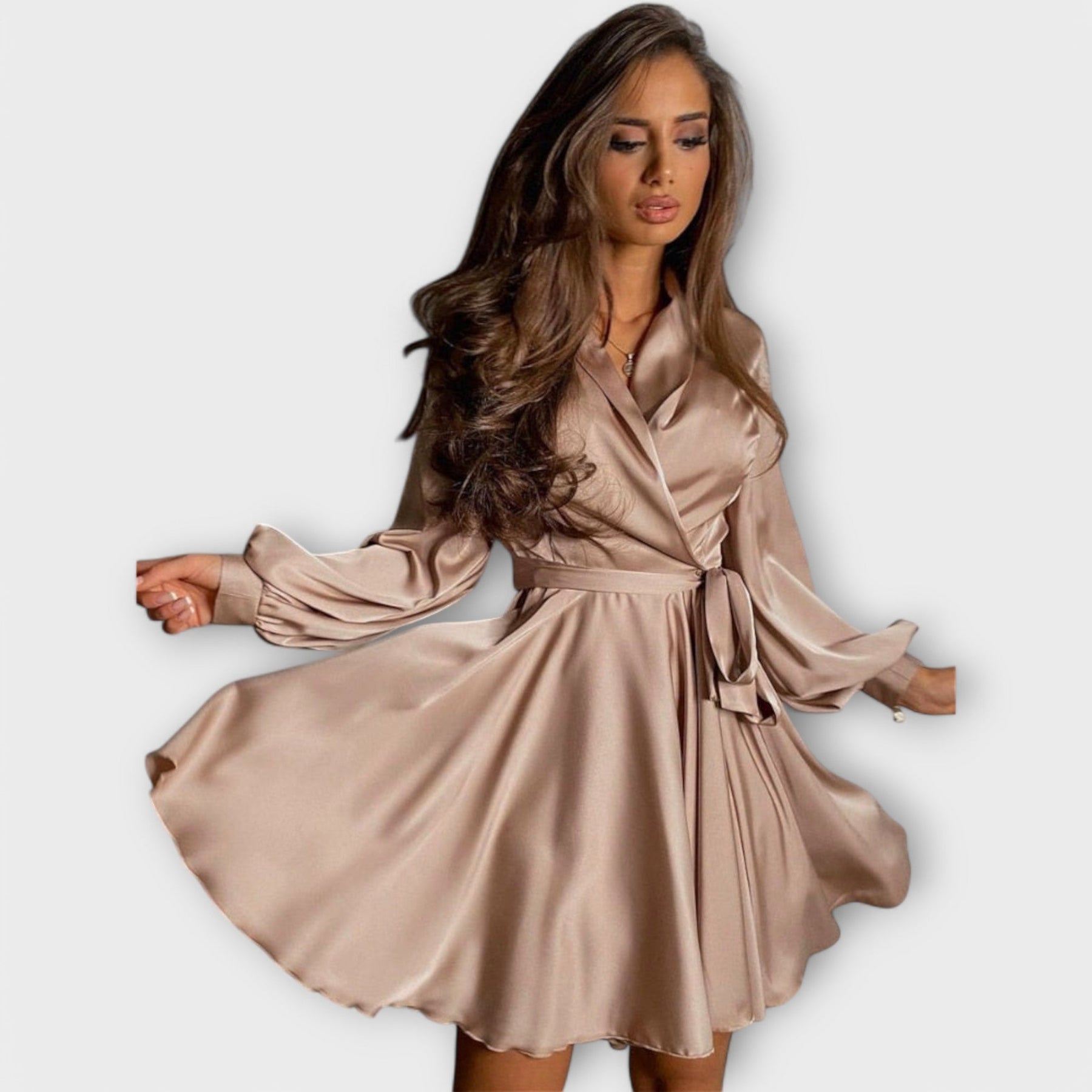 Made from luxurious satin fabric, this dress offers a refined appearance. The wrap design accentuates feminine curves and provides a flattering fit. With an ideal length just above the knee, this dress pairs perfectly with elegant heels for an extra stylish look.
